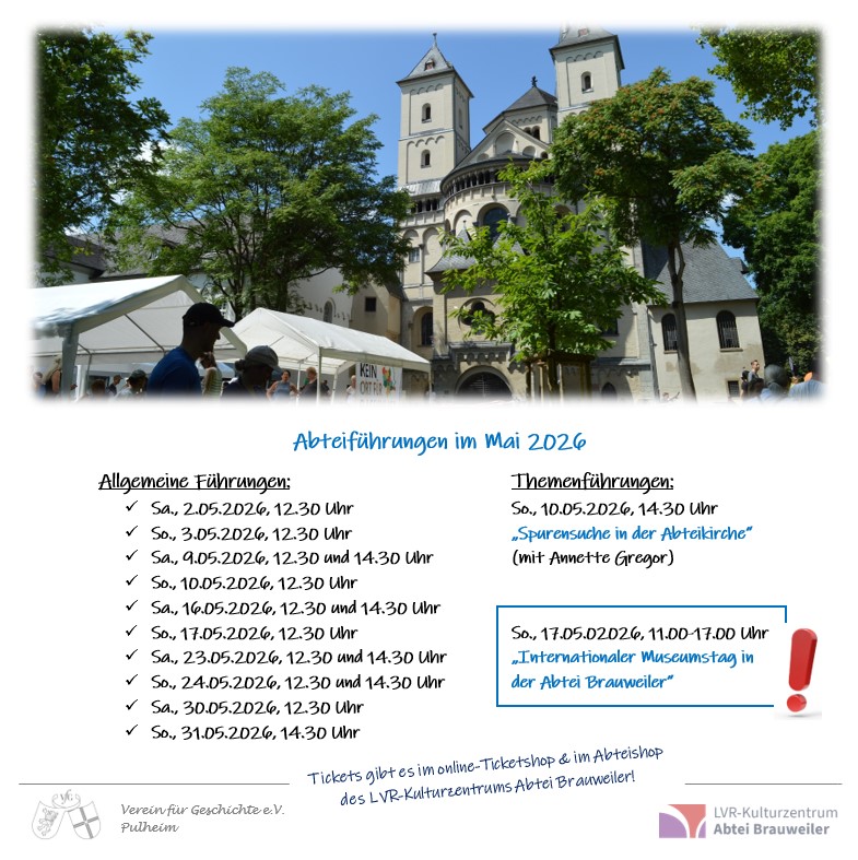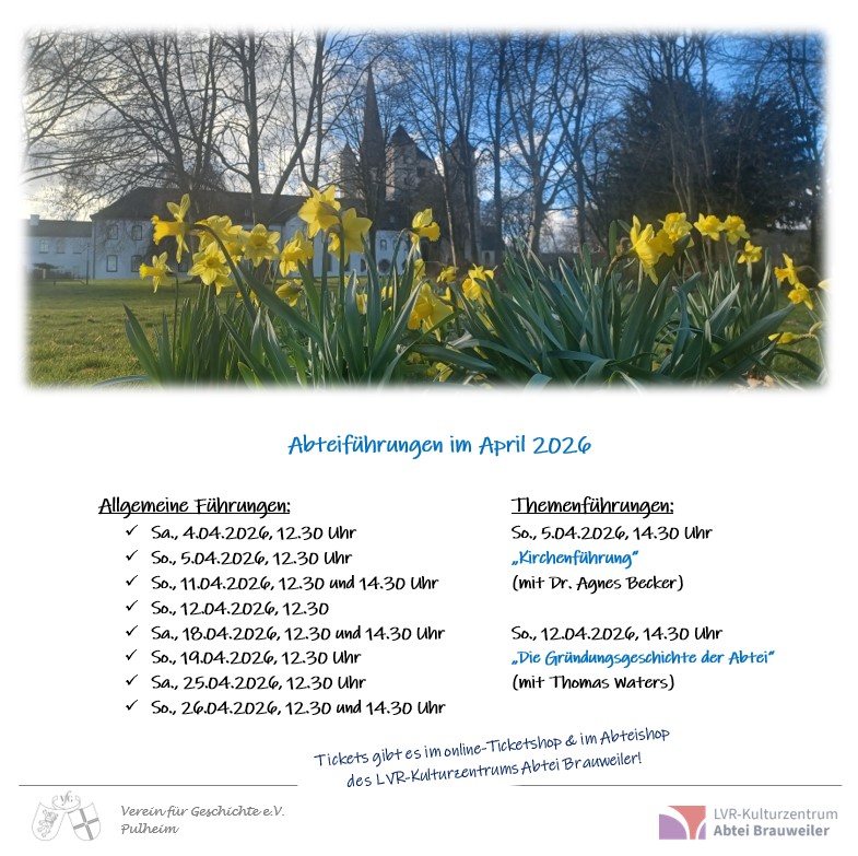 In Zusammenarbeit mit dem LVR-Kulturzentrum Abtei Brauweiler bieten wir regelmäßig allgemeine Abteiführungen an. Darüber hinaus gibt es Themenführungen.