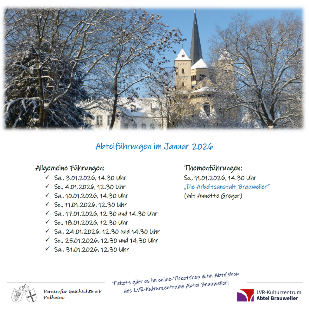 In Zusammenarbeit mit dem LVR-Kulturzentrum Abtei Brauweiler bieten wir regelmäßig allgemeine Abteiführungen an. Darüber hinaus gibt es Themenführungen.